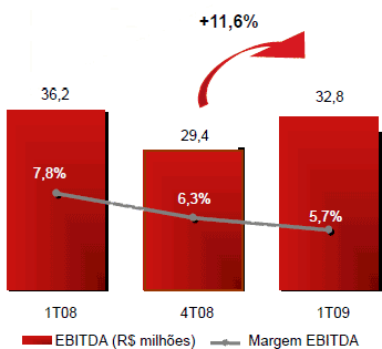 O EBITDA aumentou 11,6% em relação ao 4º trimestre/08, num total de R$ 32,8 milhões, com contração de 0,6 p.p. na margem, devido ao realinhamento dos preços com a crise global e custos inicialmente maiores com a nova planta da Minerva Dawn Farms. Após janeiro e fevereiro ainda impactados pela crise internacional, a margem em março já se recuperou para níveis históricos, continuando em abril, reflexo de recente racionalização da indústria e recuperação das exportações.