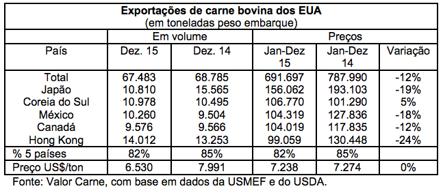 Embora tenha terminado 2015 com uma queda de 12% em seus embarques, dezembro foi o mês de menor retrocesso interanual. O Egito foi seu principal cliente, superando a Rússia, país que duplicava suas compras em 2014. A queda de 45% nas vendas ao país euroasiático fez com que passasse ao segundo lugar. Também se reduziram as compras de Hong Kong, enquanto o Irã aumentou suas aquisições em 60%. Outro destaque foi a China que, apesar de ter-se somado em junho conseguiu ficar entre os primeiros cinco destinos do ano. O país foi um dos que mais sofreu a queda de preços devido à sua concentração em mercados com problemas econômicos (Rússia, Venezuela). Um dado a ser considerado no futuro é que a grande oferta de carne à China está fazendo cair os preços nesse destino.
