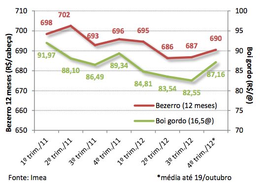 No entanto, a relação de troca na comparação dos últimos 12 meses registrou queda de 10%. Isto em função do aumento de 12% do preço do insumo, enquanto o boi gordo, com a recuperação do último mês, retornou ao mesmo patamar de setembro de 2011.