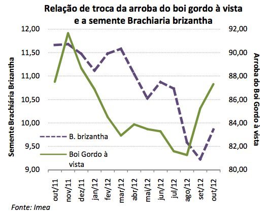 Com o início do período das chuvas, os pecuaristas já se programaram quanto à compra de sementes de capim e insumos para a recuperação de suas pastagens, com isso, as sementes de B. brizantha segue em queda no varejo. Em outubro/12 ficou cotado a R$ 9,86/kg, queda de 14,90% em relação a março/12, quando foi registrado o maior valor, a R$ 11,58/kg. O oposto ocorreu com o preço da arroba do boi gordo à vista, que em março foi cotado a R$ 82,92, valor 5,30% menor comparado ao preço médio de outubro/12, R$ 87,31. Com isso, a relação de troca entre a arroba do boi gordo e o quilo da semente de Brachiaria brizantha seguiu apresentando melhora de 23,68%, passando de 7,16 kg/@ em março para 9,24 kg/@ em outubro deste ano.