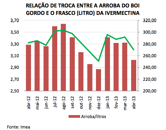 Segundo levantamento de custo de produção e benfeitorias do Imea, a relação de troca entre a arroba do boi gordo e a ivermectina é positiva para o pecuarista mato-grossense. O preço da ivermectina variou negativamente em 4,21%, cerca de R$ 11,87 no comparativo abr/12 a abr/13, saindo de um preço de R$ 282,12/litro para R$ 270,25/litro. Por outro lado, a arroba do boi gordo sofreu uma valorização em seu preço, partindo de R$ 85,87 em abr/12 para R$ 89,36 em abr/13, um ganho de R$ 3,49. Portanto, para o pecuarista de Mato Grosso comprar um litro de ivermectina no mês de abril era necessária a venda de 3,02 arrobas do boi gordo, valor melhor ao registrado no mesmo período no ano passado, quando eram necessárias 3,29 arrobas para compra de um litro.