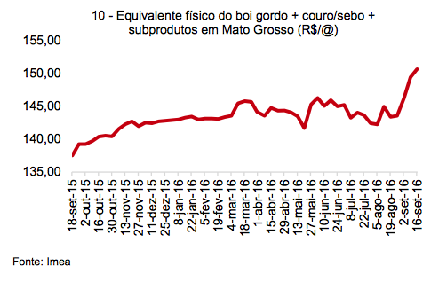 – Acompanhando o ritmo de alta do equivalente físico (EF), o equivalente físico + couro/sebo (EC) obteve aumento de 0,83%, encerrando a semana no valor de R$ 138,68/@.