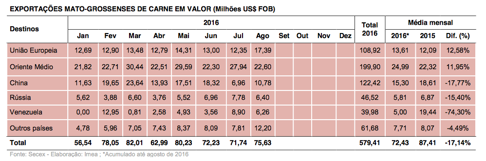 Mais carne: O IBGE divulgou na última quinta-feira (15/09) a pesquisa trimestral do abate de animais com dados referentes ao 2o trimestre de 2016. Com isso, tornou-se possível a realização de comparações semestrais. Dito isso, observa-se que o país registrou redução de 0,48% na produção de carcaça bovina no comparativo entre os primeiros semestres de 2016 e 2015, foram produzidas 3,67 milhões de toneladas no último semestre, menor volume desde o primeiro semestre de 2012. Em Mato Grosso, a situação foi um pouco diferente, visto que a produção de carne bovina aumentou 5,12% na comparação semestral, atingindo um total de 593,20 mil toneladas no primeiro semestre de 2016. Esse incremento na produção mato-grossense deve-se, principal- mente, ao maior peso de abate dos bovinos. Mato Grosso caminha na vanguarda da pecuária brasileira, se posicionando como o maior produtor de carne bovina e abatendo um dos bovinos mais pesados do país.