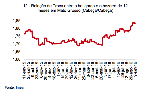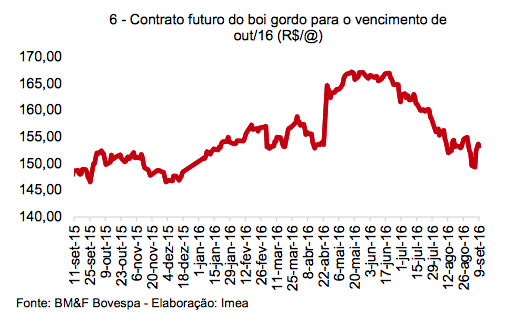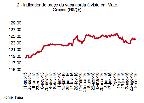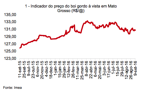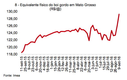 Sazonalidade: Na última semana, o Indea-MT disponibilizou os dados de abate dos animais mato-grossenses referentes agosto/16. E como já era de se esperar, o número de bovinos abatidos registrou queda de 7,85% no comparativo mensal, ficando em 397,82 mil animais. O destaque deste mês fica por conta da composição do abate, já que a proporção machos/fêmeas atingiu o maior valor do ano e o maior valor para um mês de agosto desde 2009, os machos compuseram 63,44% da “linha de abate”. Dentre os fatores causadores desta redução está a seca, típica desta época do ano, e que desde maio vem assolando as pastagens mato-grossenses. Além disso, o confinamento, sistema de produção comumente utilizado para engordar bovinos no Estado no período da seca, apresentou grandes baixas em suas expectativas, e como se pode observar, isto já tem e deve continuar tendo impacto na entrega de animais para abate.