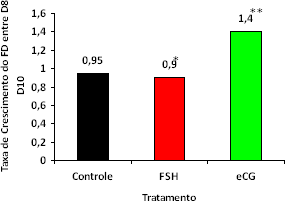 No estudo de dinâmica folicular, houve efeito do tratamento (P = 0,001) na taxa de ovulação (Gráfico 1), no crescimento folicular diário (P = 0.006) entre o D8 e D10 (Gráfico 2) e no diâmetro do folículo dominante na IATF (Gráfico 3). Ainda, houve interação entre os tratamentos (eCG e FSH) e o ECC (P = 0,03) na taxa de ovulação, sendo que o tratamento com eCG aumentou a taxa de ovulação das vacas com baixo ECC (<2,75). Gráfico 1. Taxa de ovulação de vacas de corte lactantes tratadas com eCG, FSH ou sem tratamento adicional (Controle) no momento da retirada do dispositivo intravaginal de progesterona (Adaptado de Salles et al., 2009)