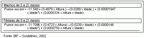 A equação recomendada utiliza a altura medida em polegadas na garupa e a idade em dias. Estas equações estão relacionadas na Tabela 6.
