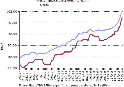 Na BM&FBovespa, os contratos de boi gordo continuam a sequência de alta. O primeiro vencimento outubro/10 fechou a R$ 103,19/@ no pregão da última quarta-feira, acumulando valorização de R$ 5,43 na semana. Os contratos que vencem em novembro/10 tiveram variação positiva de R$ 5,85, fechando a R$ 103,86/@.