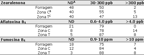 Cavallarin et al. (2004) realizaram o monitoramento em 20 fazendas localizadas no norte da Itália sobre a distribuição espacial de micotoxinas (zearalenona, aflatoxina B1 (AFB1) e fumosina B1) presentes em silagens de milho (Tabela 1). Nas zonas periféricas que estavam evidentemente deterioradas foram observados valores até 40 vezes superiores àqueles relacionados com a forragem que deu entrada no silo, entretanto nas zonas centrais e nas áreas não deterioradas os valores se mantiveram semelhantes à forragem original.
