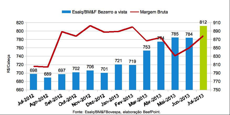 Gráfico 1. Indicador Esalq/BM&FBovespa bezerro à vista x margem bruta