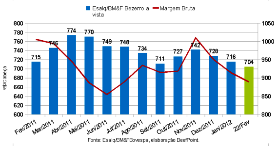 A margem bruta na reposição ficou em R$ 889,08 com valorização de 2,61% na semana e desvalorização de 3,74% em trinta dias, quando estava calculada em R$ 923,65 em 18/jan. Observe no gráfico abaixo.