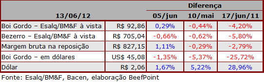 Comparando o indicador do boi gordo à vista em 13/jun com o vencimento do contrato futuro do boi gordo para nov/12, observa-se alta de 9,63% no valor da arroba negociada, de R$92,86 para R$101,80 em nov/12.