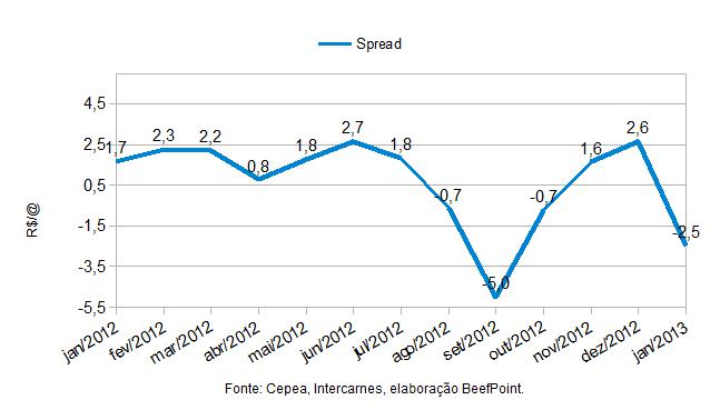 Comparando-se o indicador do boi gordo à vista em 9/jan com o vencimento do contrato futuro do boi gordo para fev/13, observa-se baixa de 2,18% no valor da arroba negociada, de R$97,58 para R$95,45 em fev/13.
