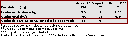 Tabela: Ganho de peso em bovinos tratados nos meses de maio, julho e setembro