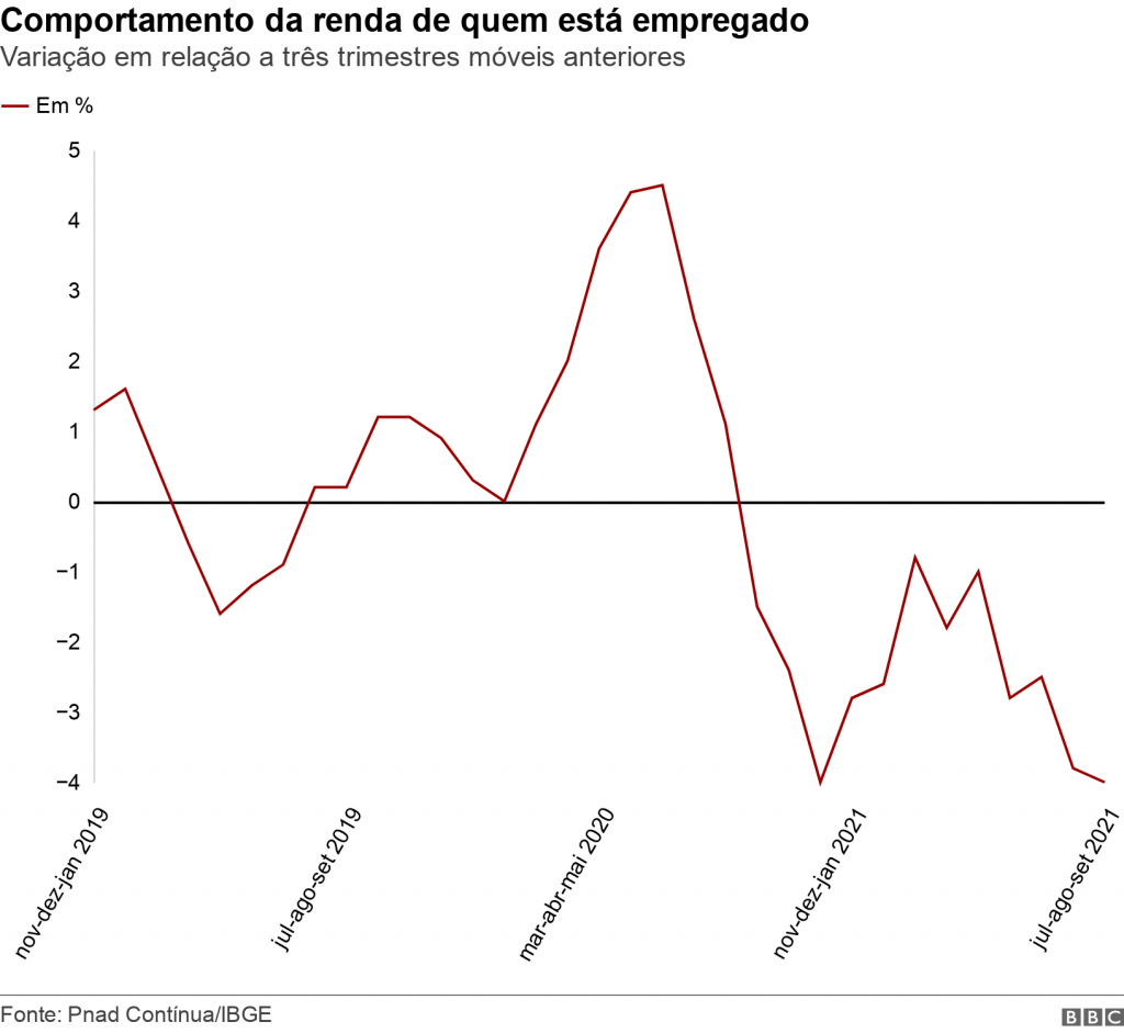 Esse último aspecto aparece nas estatísticas da Pesquisa Nacional por Amostra de Domicílios (Pnad) Contínua, que mostra que a renda média de quem está empregado vem diminuindo consecutivamente há 12 meses, desde outubro de 2020.