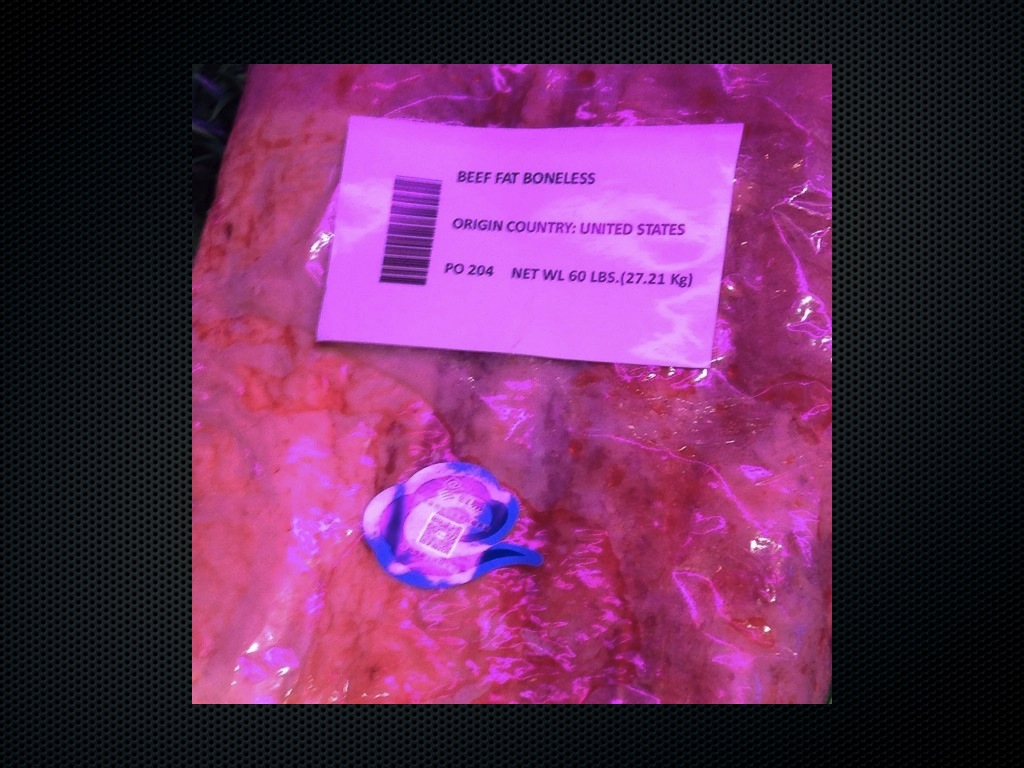Fonte: USMEF Para se ter uma ideia de volumes, se Hong Kong consumisse toda carne que importa, teria um consumo per capita de carne bovina acima de 100 kg por pessoa por ano, ou seja, acima do Uruguai, maior consumo do mundo. A situação é tão diferente do que eu estava acostumado, que eu flagrei uma “prova viva” de contrabando na principal feira de negócios de carnes da China. Eu estava andando pela feira, visitando stands, olhando os produtos, provando aperitivos, em companhia de várias pessoas dos EUA, em especial, equipe da USMEF (o equivalente a ABIEC dos EUA). Ao chegar num stand, vi uma embalagem de carne (foto abaixo) e perguntei o que era aquilo e mostrei aos gringos. Eles ficaram todos meio sem graça, pois a carne dos EUA também estava proibida de entrar legalmente na China. E apesar disso, estava exposta como produto especial no stand na principal feira. Ficou claro para mim que era muito mais fácil do que eu imaginava.