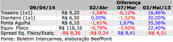 Comparando-se o indicador do boi gordo à vista em 09/abr, com o vencimento do contrato futuro do boi gordo para mai/14, observa-se baixa de 6,12% no valor da arroba negociada, de R$ 124,52 para R$ 117,34 em mai/14.