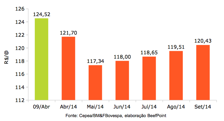 Entre os contratos futuros negociados para abr/14 e mai/14 observa-se baixa de 3,72% no valor da arroba negociada, de R$ 121,70 para R$ 117,34.