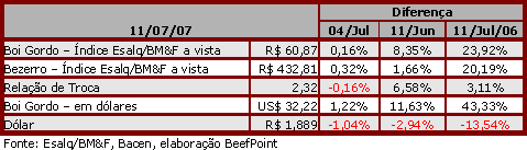 O mercado do boi gordo teve uma alta bastante tímida essa semana, com o indicador Esalq/BM&F boi gordo à vista cotado a R$ 60,87/@, (+0,16%) na semana. O indicador de bezerro também teve alta, sendo cotado a R$ 432,81/cabeça, com uma valorização de 0,32%. A relação de troca continua permaneceu estável em relação a semana passada em 1:2,32, houve uma melhora de 3,11% em relação ao valor do dia 11 de junho de 2006, quando a relação de troca era de 1:2,25.
