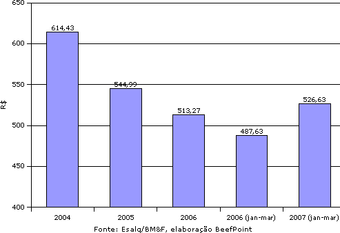 O ano de 2006 foi um ano difícil para a pecuária de corte brasileira. No ano passado, o indicador Esalq/BM&F, para preços do boi gordo à vista em SP teve média de R$ 52,74/@, frente aos R$ 54,63/@ em 2005 (-3,45%) e R$ 59,94/@ em 2004 (-12,01%). Nos três primeiros meses de 2006 os preços foram ainda piores, média de R$ 49,92/@. Mesmo com aumento das exportações, o setor produtivo amargou reduções na receita e aumento de custos. O ano de 2007 começa com perspectivas melhores. Nos três primeiros meses, a média de preços foi de R$ 54,88/@, 9,9% acima do mesmo período de 2006.
