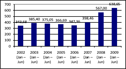 Gráfico 2. Relação de troca média, de janeiro a junho, de 2002 a 2009