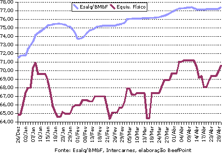 No atacado, o traseiro foi cotado a R$ 5,40, alta de R$ 0,10, enquanto o dianteiro e a ponta de agulha permaneceram inalterados com cotações de R$ 4,20 e R$ 3,70, respectivamente. O equivalente físico foi calculado em R$ 70,67/@, alta de R$ 0,72. O spread (diferença) entre indicador Esalq/BM&F e equivalente físico ficou em R$ 6,79/@.