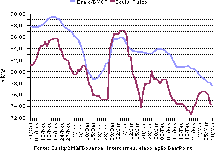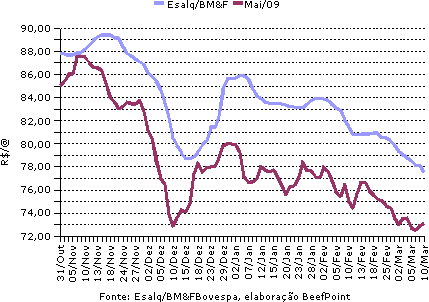 Na BM&FBovespa, o primeiro vencimento, março/09, fechou a R$ 76,24/@, com variação negativa de R$ 0,26, também apresentaram retração os contratos para abril, julho, agosto, setembro e dezembro. O contratos com vencimento em maio/09 registraram alta de R$ 0,22, fechando a R$ 73,12/@, com 4.928 contratos negociados e 6.202 contratos em aberto. Outubro/09 fechou a R$ 78,98/@, com valorização de R$ 0,06.