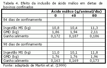 No segundo experimento, foram avaliados os efeitos do ácido málico, nas quantidades de 0, 40 e 80 g/animal/dia, sobre a ingestão, desempenho e conversão alimentar de bovinos de corte confinados com altos teores de concentrado na dieta (tabela 3).
