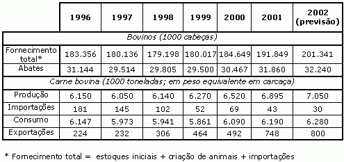 As exportações de carne bovina do Brasil deverão atingir o recorde de 800 mil toneladas em 2002, seguindo uma série de recordes. O Brasil é o terceiro maior exportador de carne bovina do mundo. Somado ao enfraquecimento de sua moeda, o Brasil pôde expandir suas exportações em 2001 devido ao surgimento de doenças nos rebanhos animais nos países competidores neste mercado (febre aftosa na Argentina e no Uruguai, EEB e febre aftosa na UE). O Brasil será capaz de aumentar suas exportações de carne bovina neste ano cerca de 50% com relação ao ano passado. Além de expandir seus mercados de exportação já existentes, como o Chile e membros da UE, o Brasil conquistou novos mercados para este produto, incluindo Egito, Irã e Arábia Saudita.