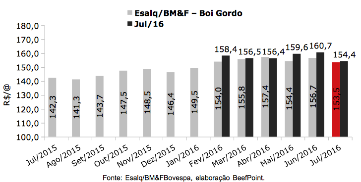 O contrato futuro do boi gordo para jul/16 apresentou baixa de R$ 0,21 e foi negociado a R$ 154,39 em relação ao dia anterior.
