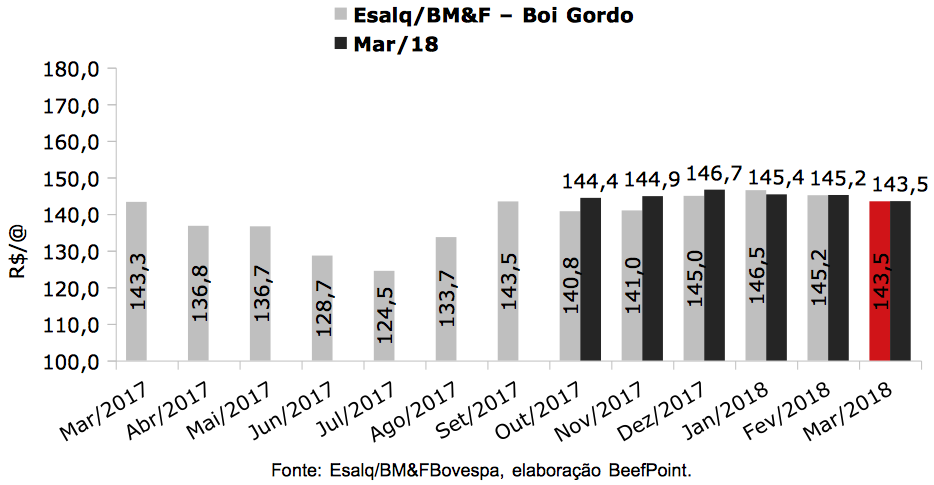 O contrato futuro do boi gordo para mar/18 apresentou baixa de R$ 0,21 e foi negociado a R$ 143,54 em relação ao dia anterior.