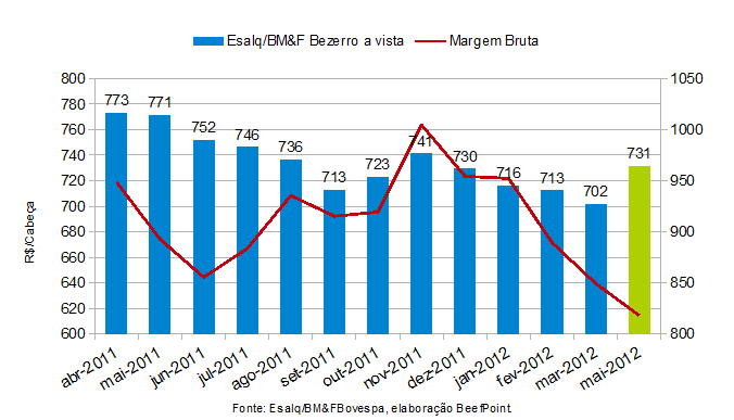 Gráfico 1. Indicador Esalq/BM&FBovespa bezerro à vista x margem bruta