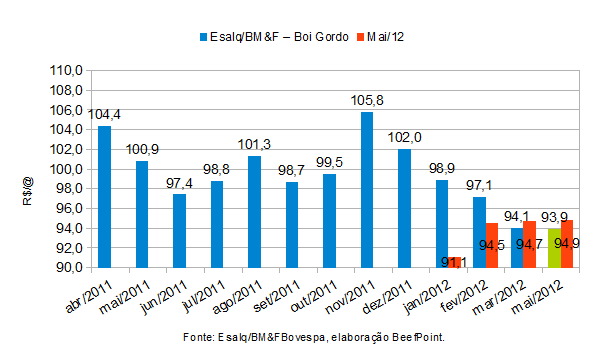 O contrato futuro do boi gordo para Mai/12 foi negociado a R$94,85 com baixa de R$ 0,34.