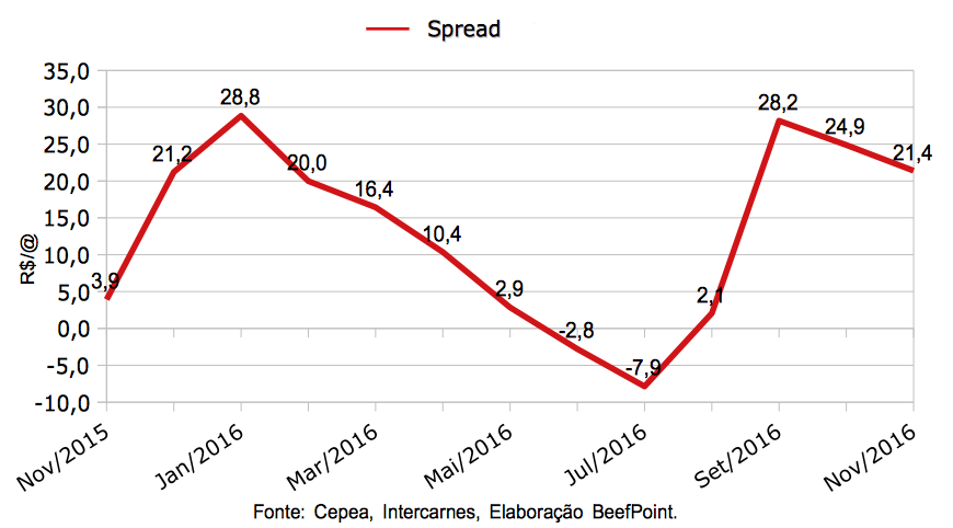 O Spread é a diferença entre os valores da carne no atacado e do Indicador do boi gordo. Desta forma, um Spread positivo significa que a carne vendida no atacado está com valor superior ao do boi comprado pela indústria, deixando assim esta margem bruta positiva e oferecendo suporte ou potencial de alta para o Indicador, por exemplo.