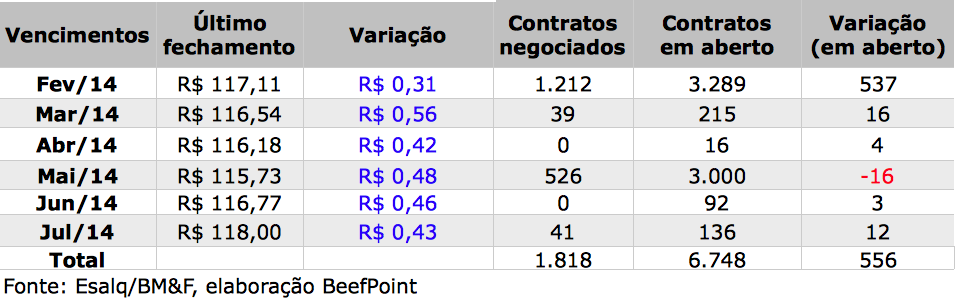 O contrato futuro do boi gordo para mar/14 apresentou alta de R$ 0,56 e foi negociado a R$ 116,54.