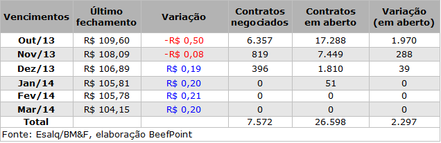 O contrato futuro do boi gordo para nov/13 teve desvalorização de R$0,08 e foi negociado a R$108,09.