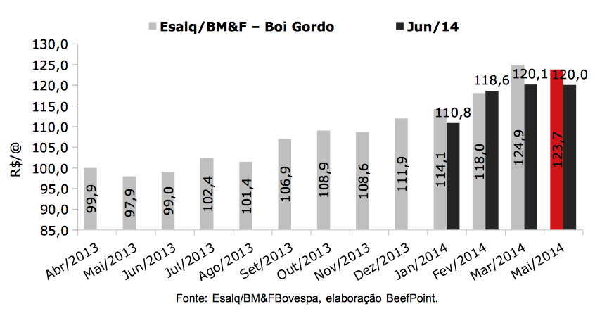 O contrato futuro do boi gordo para jun/14 apresentou alta de R$ 0,40 e foi negociado a R$ 120,00, em relação ao dia anterior.