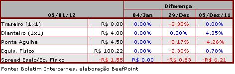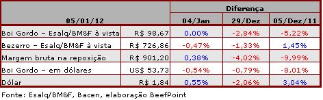 O contrato futuro do boi gordo para fevereiro/12 foi negociado a R$96,35 com variação em baixa de R$1,00.