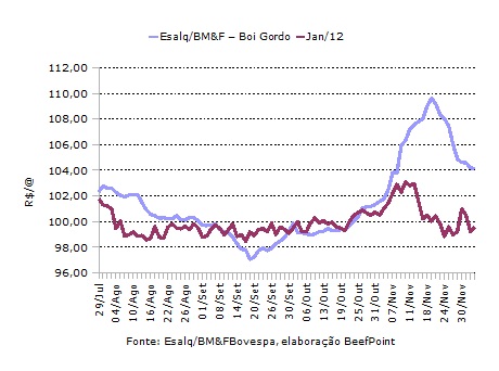 O contrato do boi gordo para janeiro/2012 foi negociado a R$99,56 com alta de R$0,32.