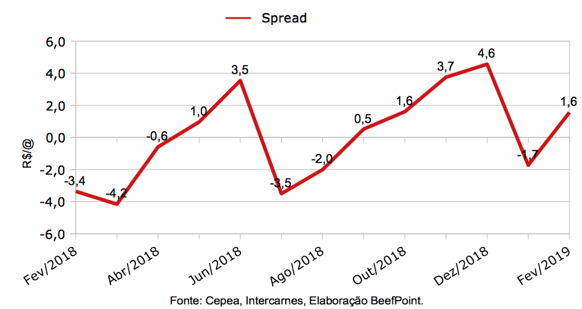 O Spread é a diferença entre os valores da carne no atacado e do Indicador do boi gordo. Desta forma, um Spread positivo significa que a carne vendida no atacado está com valor superior ao do boi comprado pela indústria, deixando assim esta margem bruta positiva e oferecendo suporte ou potencial de alta para o Indicador, por exemplo.