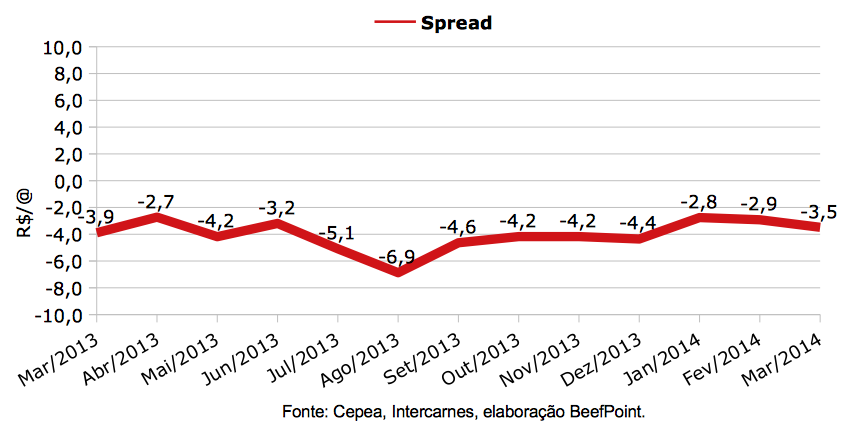 O Spread é a diferença entre os valores da carne no atacado e do Indicador do boi gordo. Desta forma, um Spread positivo significa que a carne vendida no atacado está com valor superior ao do boi comprado pela indústria, deixando assim esta margem bruta positiva e oferecendo suporte ou potencial de alta para o Indicador, por exemplo.