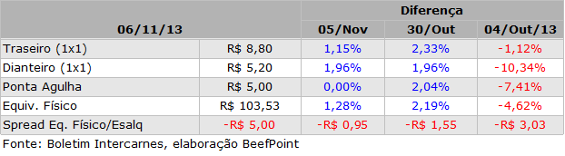 O contrato futuro do boi gordo para dez/13 teve valorização de R$0,24 e foi negociado a R$106,98.
