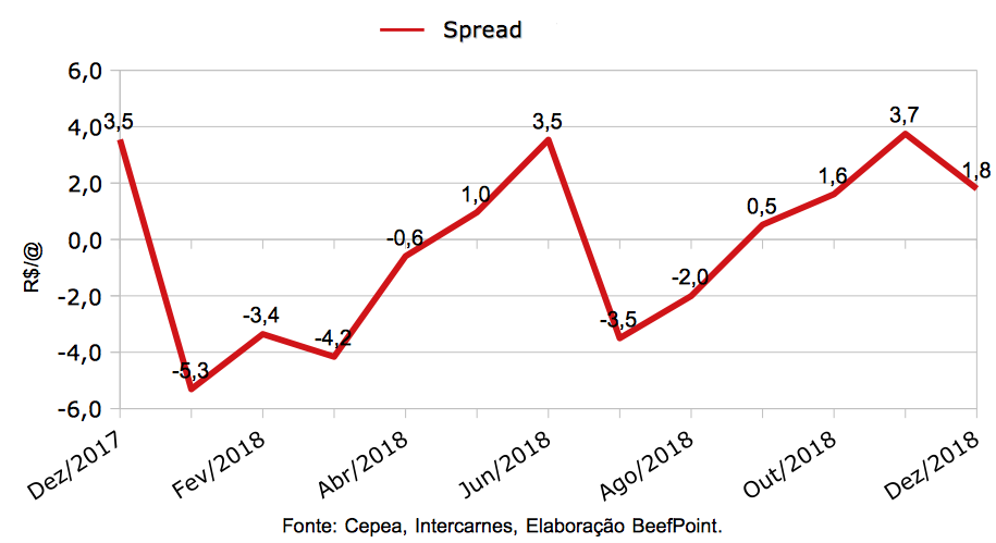 O Spread é a diferença entre os valores da carne no atacado e do Indicador do boi gordo. Desta forma, um Spread positivo significa que a carne vendida no atacado está com valor superior ao do boi comprado pela indústria, deixando assim esta margem bruta positiva e oferecendo suporte ou potencial de alta para o Indicador, por exemplo.