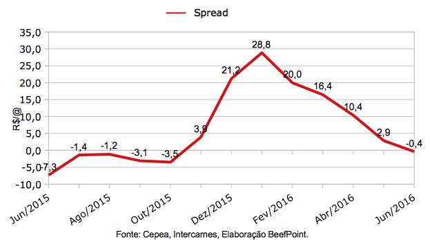 O Spread é a diferença entre os valores da carne no atacado e do Indicador do boi gordo. Desta forma, um Spread positivo significa que a carne vendida no atacado está com valor superior ao do boi comprado pela indústria, deixando assim esta margem bruta positiva e oferecendo suporte ou potencial de alta para o Indicador, por exemplo.
