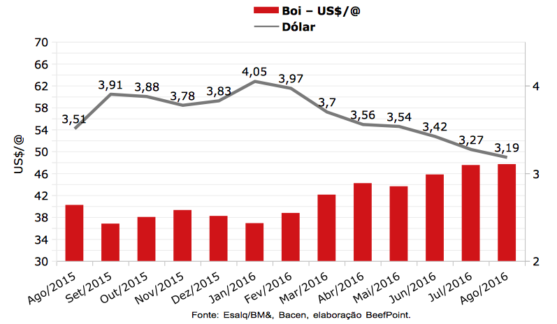 | Fonte: Esalq/BM&F, Bacen, elaboração BeefPoint | ||||