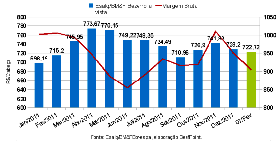 Gráfico 1. Indicador Esalq/BM&FBovespa bezerro à vista x margem bruta