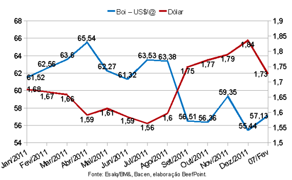 Gráfico 2. Indicador de Esalq/BM&FBovespa boi gordo à vista em dólares e dólar