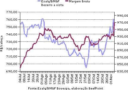 Gráfico 1. Indicador Esalq/BM&FBovespa bezerro à vista x margem bruta