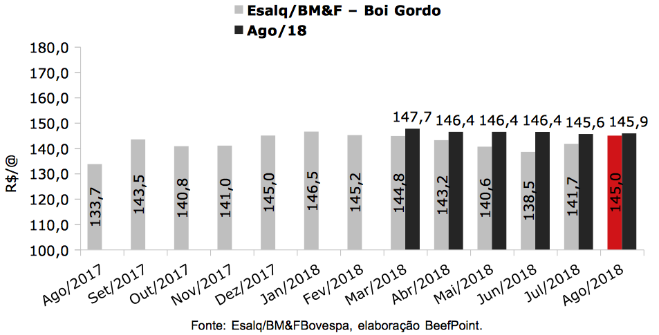 O indicador Esalq/BM&FBovespa boi gordo apresentou alta de 0,87%, nessa quarta-feira (08) sendo cotado a R$ 144,95/@. O indicador a prazo foi fechado em R$ 147,07.