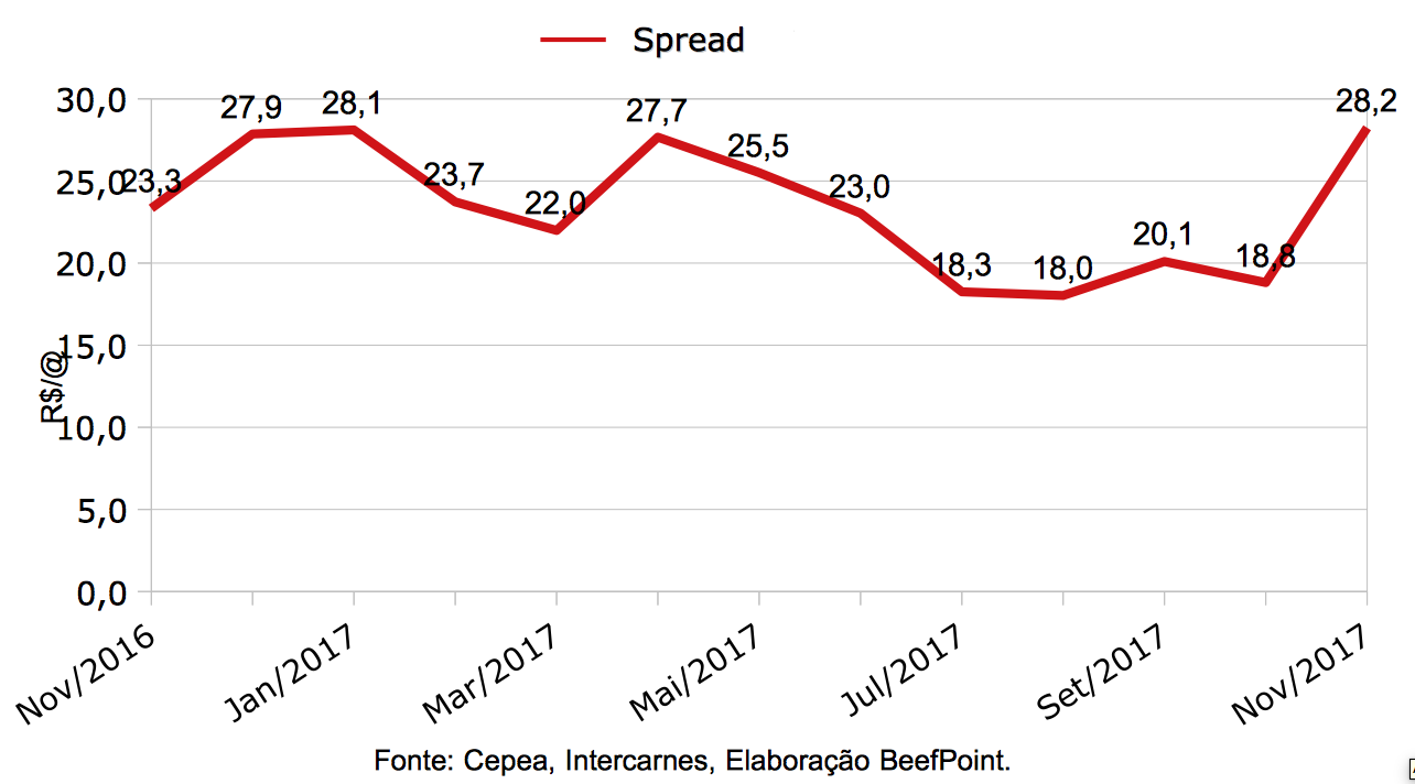 O Spread é a diferença entre os valores da carne no atacado e do Indicador do boi gordo. Desta forma, um Spread positivo significa que a carne vendida no atacado está com valor superior ao do boi comprado pela indústria, deixando assim esta margem bruta positiva e oferecendo suporte ou potencial de alta para o Indicador, por exemplo.