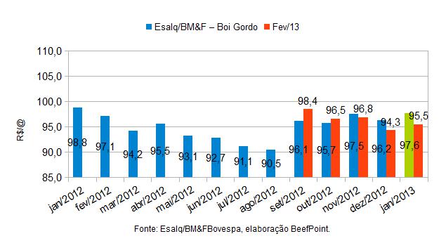 O contrato futuro do boi gordo para Fev/13 teve desvalorização de R$0,45 foi negociado a R$95,45.